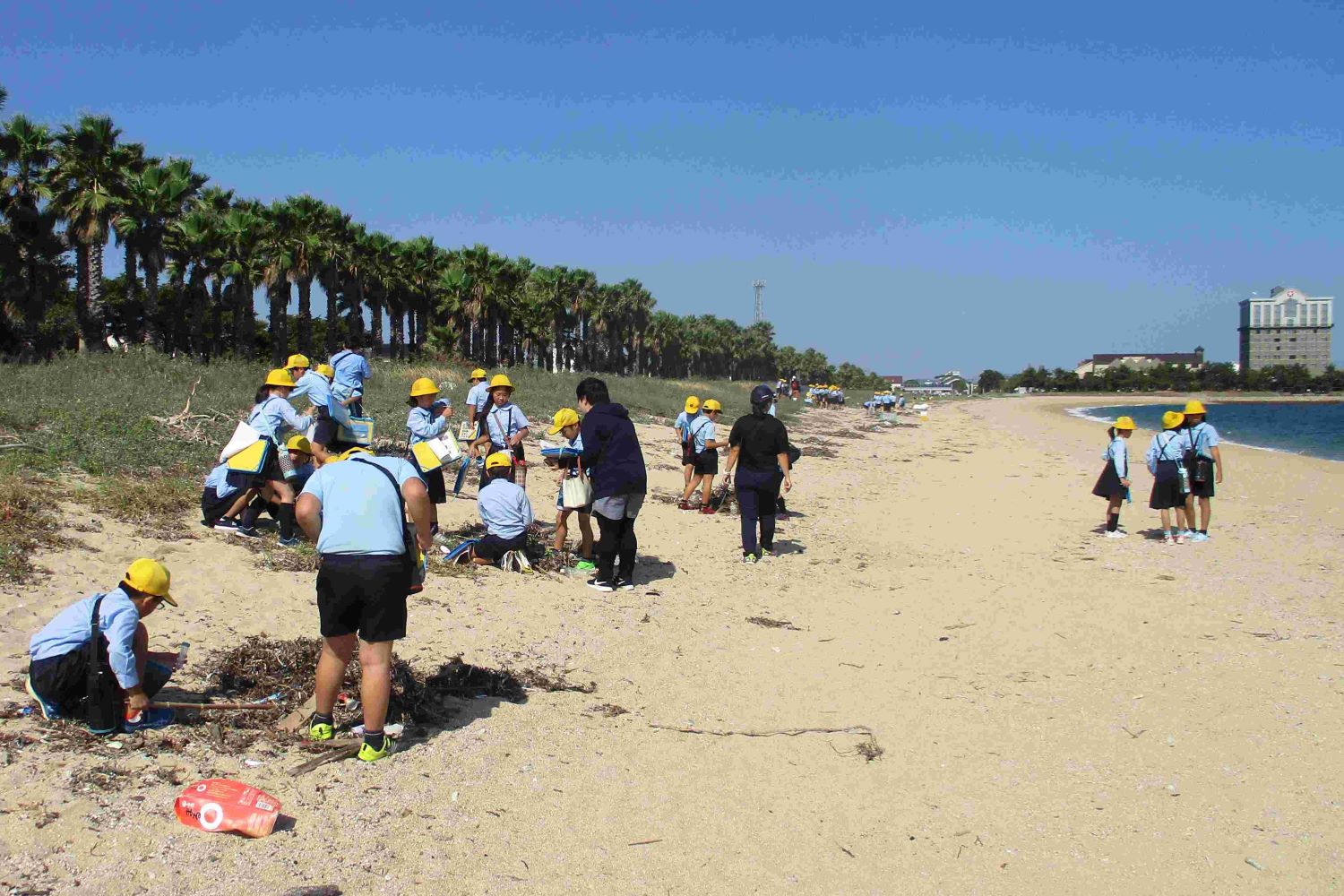 基于这一指引,今治事业所与爱媛县自然保护科、爱媛县生物多样性中心及当地NPO组织合作,获取关于海兰草等植物保护的专业知识与建议。同时,事业所积极邀请当地自治会和邻近企业共同参与,启动了维护海兰草生长环境的土地整治活动。海兰草的生长数量曾一度减少至危机水平,为此,爱媛县生物多样性中心开展了育苗工作。2015年,在今治事业所的协调下,该中心携手当地小学——富田小学的学生,将培育出的幼苗移植到织田滨。从此,今治事业所持续组织该校四年级学生在织田滨进行自然观察活动,并自2017年起推进“织田滨动植物地图绘制”项目。近年来,学生们不仅关注海滩上的垃圾问题,还开展垃圾清理和分类分析工作。此外,为了维持织田滨的美丽景观及生物栖息环境,企业和当地组织也积极开展环保宣传活动。